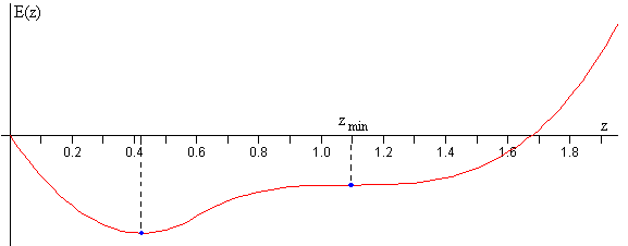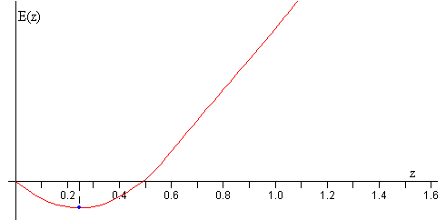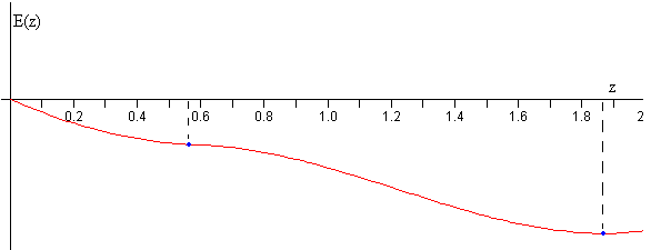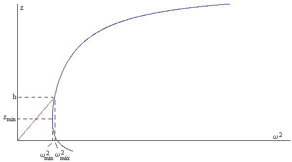Configuración A. El valor de la velocidad angular ω de rotación que hace que z=h, es decir, desaparezca el líquido del brazo vertical más cercano al eje de rotación es Se representa la función en el intervalo 0<ω<ωmáx, que es la línea recta de color rojo de la figura Configuración B La relación entre z y la velocidad angular de rotación ω es más compleja y se representa por la curva de color azul de la figura Despejamos z en función de ω2, obtenemos la ecuación de segundo grado Las raíces de la ecuación son Para un valor dado de ω>ωmin, existen dos valores de z uno corresponde a un equilibrio estable y el otro inestable, tal como veremos en el análisis energético. El valor de ωmin se obtiene cuando las raíces son iguales, es decir, cuando el discriminante es cero B2=C, y zmin=B Si tomamos el signo positivo de la raíz, obtendríamos un valor de z negativo, en cambio el valor negativo la raíz da lugar a un valor z positivo Para la velocidad angular La altura adicional del líquido zmin en el brazo vertical más alejado del eje de rotación, que corresponde a esta velocidad angular es Podemos obtener zmin de forma alternativa, derivando ω2 respecto de z en la expresión e igualándola a cero, Con los datos numéricos proporcionados al principio de este apartado h=0.6, a=0.85 y d=2.0.