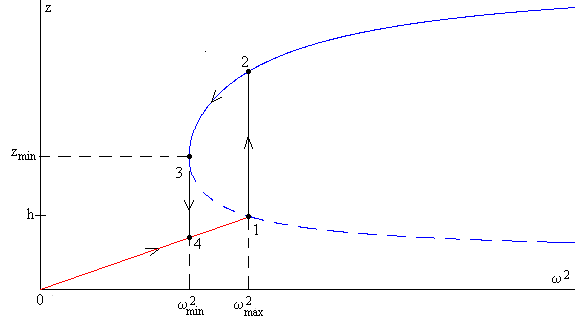 Cuando seleccionamos un par de valores (a, h) que corresponden a un punto del plano (x, y) interior de la región amarilla se obtiene una representación grafica de z en función de ω2 similar a la de la figura al principio de este apartado. El sistema presenta histéresis.