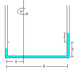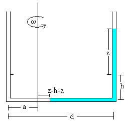 Cuando se incrementa la velocidad angular de rotación 0<ω<ωmax, el tubo en U adopta la configuración A, la altura z del líquido en el brazo más alejado del eje de rotación, por encima de la altura de equilibrio h, se incrementa linealmente con ω2 (recta de color rojo) Cuando la velocidad angular de rotación ω alcanza el valor ωmax, (estado 1) desaparece el líquido del brazo vertical más cercano al eje de rotación z=h. El sistema experimenta un salto (estado 2), estando descrito su comportamiento por la configuración B, la altura z que alcanza el líquido se obtiene poniendo ω=ωmáx en la raíz de la ecuación que describe la configuración B. Si disminuye la velocidad angular, el comportamiento del sistema sigue el camino 2, 3. Cuando alcanza el estado 3, que corresponde al par de valores (ωmin, zmin) experimenta un nuevo salto al estado 4, descrito por la configuración A. Si disminuye aun más la velocidad angular, la altura z disminuye linealmente hasta que alcanza el estado inicial de equilibrio z=0, cuando ω=0. Los distintos casosSe debe tener en cuenta que la distancia del eje de rotación a un brazo vertical más cercano es a<d/2, siendo d la longitud del brazo horizontal.