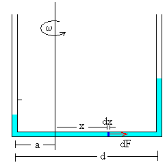 La fuerza centrífuga total sobre el líquido situado en el brazo horizontal a ambos lados del eje se obtiene integrando desde x=-a hasta x=d-a. que es la diferencia de las dos fuerzas centrífugas que actúan sobre las porciones de líquido situadas a uno (0 a d-a) y otro lado (de 0 a a) del eje de rotación. Brazos verticales