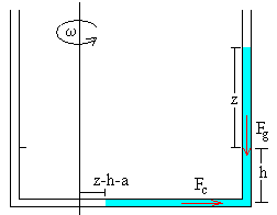 La energía potencial gravitatoria del líquido contenido en los dos brazos verticales es La energía potencial gravitatoria del líquido contenido en el brazo horizontal es cero. Energía potencial centrífuga Calculamos primero la energía potencial centrífuga del líquido contenido en el brazo vertical más cercano al eje de rotación cuyo radio es a, y la del líquido contenido en el brazo vertical más alejado del eje de rotación cuyo radio es d-a, La energía potencial centrífuga del líquido contenido en el brazo horizontal, es la suma de la energía potencial de cada uno de los elementos de masa dm que distan x del eje de rotación. La energía potencial total del líquido en la configuración A es Ep(z)=E1c+E2c+Eg Configuración BEnergía potencial gravitatoria