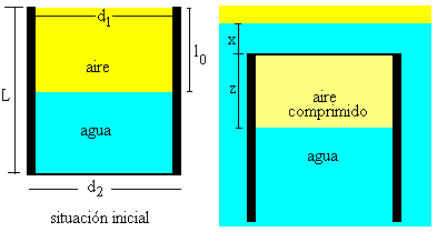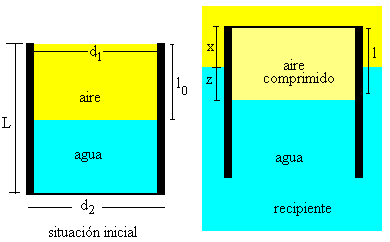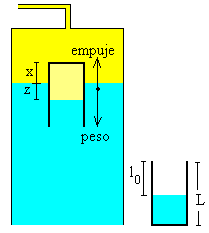 Se cumplirá que P0·l0=(P+ρgz)·(x+z) (2) Situación de equilibrioEl tubo permanece en equilibrio cuando el peso se igual al empuje o bien, cuando F=0. Conocida la presión P podemos determinar x y z resolviendo un sistema de dos ecuaciones (1) y (2) con dos incógnitas. De la segunda ecuación despejamos x