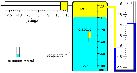 Esta página es una continuación de la página titulada la flotación de un barco, que estudia las fuerzas sobre un recipiente que contiene una burbuja de aire en su interior, y de la página titulada las oscilaciones de una boya, que estudia el MAS de una boya que flota en el mar y sobre la cual salta un marinero en el instante inicial. El diablillo o ludión es un tubo de ensayo de longitud L, de diámetro interior d1 y de diámetro exterior d2 que se llena parcialmente de agua hasta una altura L-l0. Luego, se invierte en un recipiente grande que contiene agua, que está cerrado y conectado por una parte, a un manómetro para medir la presión del aire encerrado en su interior y por otra, a una jeringa que nos permite variar la presión P del aire del recipiente. Estática del diablilloEn este apartado, estudiaremos el equilibrio del tubo de ensayo (diablillo) con la burbuja de aire dentro Control de la presiónPara variar la presión del aire contenido en el recipiente se emplea una jeringa. Si el volumen total de aire del recipiente y de la jeringa es V0. Al disminuir en x el volumen de la jeringa la presión aumenta de P0 a P. Si suponemos una transformación isotérmica, tendremos que: P(V0-x)=P0·V0 Si x<<V0 podemos hacer la siguiente aproximación El incremento de presión ΔP=P-P0 es proporcional a la variación del volumen x de la jeringa o bien, al desplazamiento de su émbolo. Peso del tubo de ensayo
