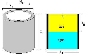 El peso del tubo de vidrio es el producto de la densidad del vidrio ρv, por el volumen V de la capa cilíndrica de vidrio y por la aceleración de la gravedad g, ρv·V·g El empuje no admite una expresión única y es distinta