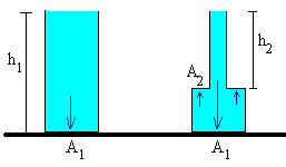 La fuerza debida a la presión que ejerce un fluido en la base de un recipiente puede ser mayor o menor que el peso del líquido que contiene el recipiente, esta es en esencia la paradoja hidrostática. Como se ha demostrado, en la ecuación fundamental de la estática de fluidos, la presión solamente depende de la profundidad por debajo de la superficie del líquido y es independiente de la forma de la vasija que lo contiene. Como es igual la altura del líquido en todos los vasos, la presión en la base es la misma y el sistema de vasos comunicantes está en equilibrio. Vamos a examinar en esta página tres ejemplos, dos simples y uno algo más complejo para explicar esta paradoja. En todos los casos, hemos de tener en cuenta que la fuerza que ejerce un fluido en equilibrio sobre una superficie debido a la presión es siempre perpendicular a dicha superficie.