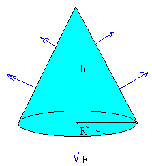 Recipiente de forma cónicaSea un recipiente en forma cónica, de altura h, cuya base tiene un radio R y que está completamente lleno de líquido.