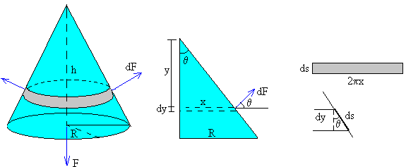 La paradoja se resuelve considerando todas las fuerzas que ejerce el líquido debido a la presión en la superficie cónica y que son perpendiculares a la misma. La fuerza dF que ejerce el líquido sobre el elemento de la superficie cónica comprendido entre y y y+dy es el producto de la presión del líquido a la profundidad y, multiplicado por el área de la superficie del tronco de cono de radio x y altura dy. El área de esta superficie es equivalente a la de un rectángulo de longitud 2πx y anchura ds=dy/cosθ. La fuerza es dF=ρgy·2πxds La componente vertical de dicha fuerza es dFy=dF·senθ= ρgy·2πxdy·tanθ La relación entre x e y y el ángulo θ es La componente vertical de la suma de todas las fuerzas que ejerce el líquido sobre los elementos de la superficie lateral del cono es La componente vertical de la resultante de las fuerzas que ejerce el líquido debido a la presión sobre superficie total del cono es que está dirigida hacia abajo, y coincide con el peso del fluido. Como hemos comprobado en estos ejemplos, la paradoja hidrostática consiste en que la fuerza debida a la presión del líquido sobre la base del recipiente puede ser diferente del peso del líquido que lo contiene. Pero esta paradoja se resuelve en el momento en el que tenemos en cuenta las componentes verticales de las fuerzas que ejerce el líquido sobre todas las paredes del recipiente originadas por la la presión.