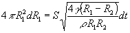 La diferencia de presión entre las esferas de radio R1 y de radio R2 serán Como consecuencia de la diferencia de presión, el aire circula por el tubo de comunicación con una velocidad dada por el teorema de Bernoulli El volumen de aire que pasa de la segunda esfera a la primera en el tiempo dt es vSdt, siendo S=πr2 la sección del tubo que comunica ambas esferas. ρ=1.29 kg/m3 es la densidad del aire El volumen de la primera esfera aumenta, y el de la segunda disminuye. dV1=Svdt Hay que resolver la integral por procedimientos numéricos Conocido el radio inicial de la esfera izquierda, R01 se calcula el tiempo t cuando dicha esfera alcanza el radio R01≤R1<V1/3 La última ecuación, indica que la suma de los volúmenes de las dos esferas es constante. Podemos considerar en esta aproximación el aire como un fluido incomprensible, ya que los cambios de presión que experimenta en el interior de las burbujas son muy pequeños, comparados con la presión atmosférica. Nota: La descripción dada en este párrafo, se debe de entender desde el punto de vista cualitativo, explica el fenómeno observado de que dos globos o dos pompas de jabón conectadas por un pequeño tubo de volumen despreciable, la esfera de mayor radio aumenta a costa de la de menor radio, hasta que esta última desaparece. Un análisis termodinámico del problema es demasiado complicado para incluirlo en estas páginas, se puede consultar el segundo artículo citado en las referencias.