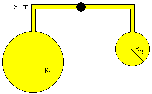 Comunicando dos pompas de jabónSi ponemos dos pompas de jabón de radios R1 y R2 en los extremos de un tubo, y abrimos la llave que las comunica veremos que la pompa de jabón de radio menor es "comida" por la pompa de radio mayor.