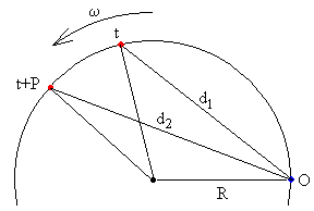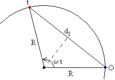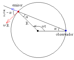 En el triángulo isósceles formado por los dos radios y la línea que une el emisor y el observador, el ángulo α vale α=π/2-ωt/2. Como vE= ωR·cos(π/2- α)= ωR·cos(ωt/2) La fórmula que describe el efecto Doppler que se produce en esta situación es
