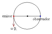 El emisor describe un movimiento circularSupongamos ahora que el emisor describe una trayectoria circular de radio R con velocidad angular ω constante. El observador en reposo está situado a una distancia R del centro de la trayectoria circular, en el origen de ángulos, tal como se muestra en la figura.