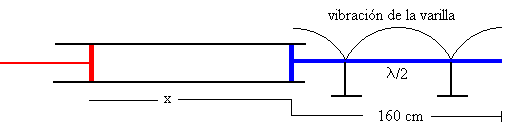 Fundamentos físicosLa velocidad el sonido en la varilla metálica vm es vm =f·lm Donde f es la frecuencia y lm es la longitud de onda en la varilla. Como vemos en la figura lm=160 cm La velocidad del sonido en el aire va es va =f·la Donde f es la frecuencia que no ha cambiado al pasar del metal al aire, y la es la longitud de onda en el aire. Eliminando la frecuencia en estas dos ecuaciones, obtenemos la velocidad del sonido en la varilla en términos de la velocidad el sonido en el aire va. Se mide la distancia ente nodos d=la/2, para varias posiciones del disco desplazable. Con este dato y la velocidad del sonido en el aire se determina la velocidad del sonido en la varilla metálica vm. Recuérdese el dato lm=160 cm. Existe también una relación entre la velocidad del sonido en una varilla vm, su módulo de elasticidad Y o de Young, y la densidad del material rm. Conocida la densidad rm del material del que está hecho la varilla, podemos determinar su módulo de elasticidad Y.