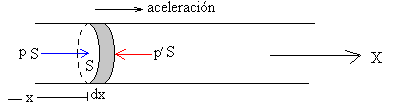 Newton supuso que la relación entre la presión y el volumen era la ley de Boyle, es decir, que la transformación era isoterma. En los libros de texto, se emplea una transformación adiabática argumentándose que no hay tiempo suficiente para que el calor fluya desde las regiones comprimidas (temperatura más alta) a las expandidas (temperatura más baja). Antes de que esto suceda, medio periodo después, la región que estaba comprimida pasa a estar expandida, y así sucesivamente. Esta argumentación, equivocadamente, nos sugiere que a altas frecuencias las ondas sonoras son más adiabáticas que a bajas frecuencias. La solución se encuentra en la teoría de la absorción y dispersión de ondas sonoras elaborada por Kirchhoff, Langevin y otros, la velocidad del sonido depende de la frecuencia. A bajas frecuencias, la velocidad del sonido se aproxima a la deducida suponiendo una transformación adiabática pVγ=cte y a altas frecuencias, la velocidad del sonido se aproxima a la deducida utilizando la ecuación de la trasformación isoterma pV=cte. (Véase el segundo artículo citado en las referencias) La relación entre la presión y el volumen en una transformación adiabática es: La diferencia de presión p respecto de la de equilibrio p0 es Desplazamiento del elemento de volumenNecesitamos ahora la ecuación del movimiento del volumen elemental que contiene una masa (densidad por volumen) ρ0A·dx. El gas a la izquierda del elemento de volumen lo empuja hacia la derecha con una fuerza pS y el gas que está a la derecha lo empuja hacia la izquierda con una fuerza p'S. Por tanto, la fuerza resultante en la dirección +X es Aplicando la segunda ley de Newton, fuerza igual a masa contenida en el elemento de por aceleración (derivada segunda del desplazamiento). Igualando ambas expresiones de la fuerza tenemos, la ecuación diferencial del movimiento ondulatorio Se puede demostrar que la presión p y la densidad r obedecen a la misma ecuación diferencial que el desplazamiento Y, con la misma velocidad de propagación v. La fórmula de la velocidad de propagación es g es el índice adiabático del gas (1.4 para el aire) y r0 es la densidad (1.293 kg/m3), y p0 la presión normal (1 atm=1.013·105 Pa) Con estos datos, la velocidad de propagación del sonido en el aire es v=331 m/s.