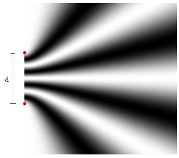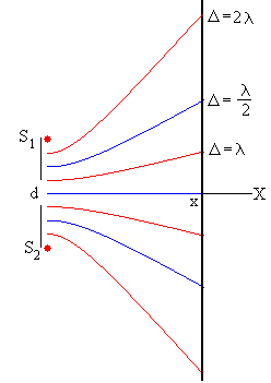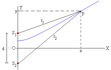Si las coordenadas del punto P son (x, y), y (0, ±d/2) son las posiciones de las fuentes, la ecuación de la curva r2-r1=Δ. es Elevando al cuadrado ambos miembros para eliminar la raíz cuadrada Elevando al cuadrado ambos miembros otra vez, obtenemos que es la ecuación de una hipérbola Si la pantalla se encuentra a una distancia x de las fuentes. Las posiciones de los máximos y los mínimos se calculan despejando y de la ecuación de la hipérbola
