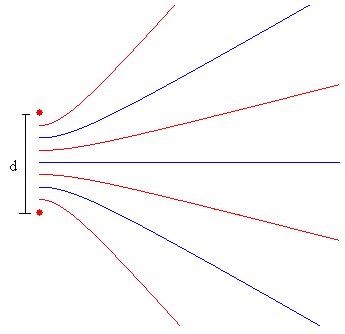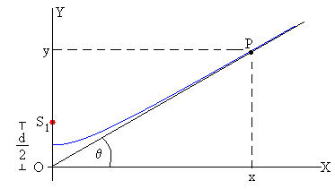 Como podemos apreciar en la figura, la hipérbola se aproxima a una recta, su asíntota, cuando nos alejamos una distancia no demasiado grande de las fuentes. Despejamos el cociente y/x en la ecuación de la hipérbola La pendiente de la asíntota se calcula en el límite cuando x→∞ Empleando la relación trigonométrica Con esta aproximación, la diferencia de caminos r2-r1=Δ≈d·senθ. Esta última relación, nos permite determinar las direcciones θ para las cuales la interferencia es constructiva o destructiva.