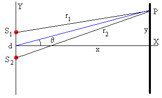 Si la separación d de las fuentes S1 y S2 es pequeña comparada con la distancia desde las fuentes hasta la pantalla, podemos despreciar la pequeña diferencia entre r1 y r2 y suponer que las amplitudes A1 y A2 son prácticamente iguales. Podemos escribir Máximos y mínimos de intensidad