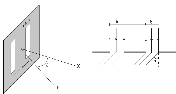 DescripciónConsideremos dos rendijas iguales de anchura b, separadas una distancia a tal como se indica en la figura. Queremos determinar la intensidad del movimiento ondulatorio en la dirección θ producida por la combinación de la interferencia de dos fuentes extensas de ondas (las rendijas) y la difracción de cada una de las rendijas.