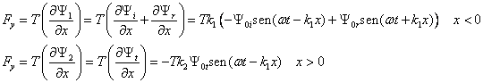 Un movimiento ondulatorio que incide sobre la superficie que separa dos medios de distintas propiedades mecánicas, ópticas, etc., en parte se refleja y en parte se transmite. La velocidad de propagación de las ondas cambia al pasar de un medio a otro, pero no cambia la frecuencia angular w. Supongamos que un movimiento ondulatorio se propaga a lo largo de dos cuerdas, la cuerda de la izquierda tiene una densidad lineal m1 y la cuerda de la derecha tiene una densidad lineal m2. El movimiento ondulatorio transversal se propaga en ellas con velocidades, respectivamente, de Siendo T la tensión de las cuerdas. Ondas incidente, reflejada y trasmitidaSituamos el origen en el punto de unión de las cuerdas. A la izquierda del origen tenemos una onda armónica incidente cuyo número de onda es k1 tal que k1v1=w , que se propaga de izquierda a derecha. Yi=Y0i·sen (w t-k1x) y una onda reflejada que se propaga con la misma velocidad de derecha a izquierda Yr=Y0r·sen (w t+k1x) Y=Y0·sen (w t-kx) es una forma alternativa de expresar la ecuación de una onda armónica conveniente para este ejemplo. En la segunda cuerda, tenemos una onda transmitida que se propaga de izquierda a derecha y cuyo número de onda es k2 tal que k2v2=w . Yt=Y0t·sen (w t-k2x) A la izquierda del origen, tenemos la superposición de dos movimientos ondulatorios, el incidente más el reflejado, Y1=Y i+Y r A la derecha del origen, solamente tenemos movimiento ondulatorio correspondiente a la onda transmitida, Y2=Y t Relación entre las amplitudes de la onda incidente, reflejada y trasmitidaEn el punto de discontinuidad o de unión de ambas cuerdas, el origen, x=0, el desplazamiento vale Y1=Y2, es decir Y0i·sen (w t)+Y0r·sen (w t)=Y0t·sen (w t) Simplificando Y0i+Y0r=Y0t Al estudiar las ondas transversales en una cuerda obtuvimos la expresión de la fuerza vertical Fy en cualquier punto de la cuerda. La fuerza Fy en cualquier punto de la cuerda cuando se propaga una onda armónica es En el origen x=0 se cumple k1(-Y0i+Y0r)=-k2Y0t Desde el punto de vista matemático decimos, que en el punto de discontinuidad situado en el origen, la función que describe el movimiento ondulatorio debe ser continua y también lo debe ser su derivada primera. Una situación análoga la encontraremos en Mecánica Cuántica al estudiar el escalón de potencial. Tenemos dos ecuaciones, que nos permiten relacionar la amplitud de la onda reflejada Y0r y transmitida Y0t en términos de la amplitud de la onda incidente Y0i Expresando el número de onda k1 y k2 en términos de las velocidades de propagación respectivas v1 y v2 ActividadesEn el siguiente applet se representan dos cuerdas unidas en el origen. En la primera región de color blanco, tenemos la superposición Y1 del movimiento ondulatorio incidente, y reflejado dibujados en una línea de color azul. En la segunda región de color rosa, tenemos el movimiento ondulatorio transmitido Y2 dibujado por una línea de color azul. Podemos observar que en el punto de discontinuidad, el origen, la función que describe el movimiento ondulatorio es continua y también su derivada primera. Asimismo, se representa en la región de la izquierda, el movimiento ondulatorio incidente y reflejado, en los colores que se indican en la parte inferior del applet. Observamos que la onda transmitida siempre está en fase con la onda incidente. Sin embargo, la onda reflejada puede estar en fase o en oposición de fase dependiendo de que la velocidad de propagación en el segundo medio v2 sea mayor que en el primero v1 o al contrario. Se introduce