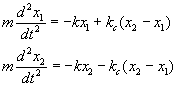 Ecuaciones del movimientoPara estudiar un sistema formado por dos osciladores acoplados, vamos a tomar como modelo el sistema formado por dos partículas iguales de masa m situadas en los extremos de dos muelles de idéntica constante elástica k. El acoplamiento se efectúa uniendo las dos partículas mediante un muelle de constante kc, tal como se puede ver en la figura. |