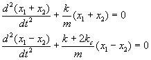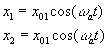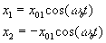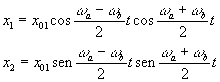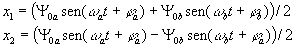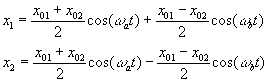 Condiciones inicialesEn el instante t=0, las posiciones iniciales de las partículas son respectivamente x01 y x02. Las velocidades iniciales son cero. Las ecuaciones se transforman después de algunas operaciones en
