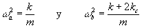 Modos normales de vibraciónEl primer modo normal de vibración de frecuencia wa se obtiene cuando los dos osciladores se mueven en fase x01 es igual a x02. El muelle central no sufre ninguna deformación y por tanto, no ejerce ninguna fuerza sobre las partículas, las cuales se mueven como si no estuvieran acopladas. El segundo modo normal de frecuencia wb se obtiene cuando los dos osciladores se mueven en oposición de fase x01 =- x02. Las ecuaciones del movimiento de cada oscilador se reducen a las siguientes.