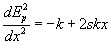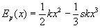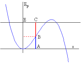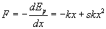 La energía potencial de la partícula es máxima en los dos puntos más alejados del origen, y es mínima en x=0, (posición de equilibrio). Lo contrario le ocurre a la energía cinética que es mínima (cero) en los dos puntos más alejados del origen y es máxima en el origen. FuerzaLa fuerza sobre la partícula debida al muelle no ideal será A la izquierda del origen x<0, la pendiente de la función Ep es negativa, la fuerza es positiva (hacia la derecha). A la derecha del origen x>0 la pendiente de la curva es positiva, la fuerza es negativa (hacia la izquierda). Las posiciones de equilibrio en las que F=0 son x=0, y x=1/s la función Ep(x) presenta un mínimo y un máximo respectivamente. La derivada segunda de la función energía potencial es