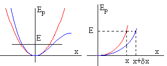 w0 es la frecuencia angular propia de una partícula de masa m unida al muelle ideal de constante k. Se ha resuelto la ecuación diferencial mediante el procedimiento numérico de Runge-Kutta, con las siguientes condiciones iniciales. En el instante t=0, la posición inicial de la partícula es x0 (a la derecha del origen) y su velocidad inicial es v0=0. En la posición inicial, la energía cinética de la partícula es cero y por tanto, la energía potencial es igual a la energía total E. Dada la energía total E de la partícula, podemos hallar la posición inicial x0. Para ello, hay que resolver la ecuación cúbica. E=kx2/2-skx3/3 Si el valor de E es menor que el máximo, la raíz de la ecuación cúbica se encuentra en el intervalo comprendido entre x=0 y x=1/s. Podemos emplear el procedimiento del punto medio para hallar rápidamente esta raíz. Posición mediaSi la energía potencial fuese simétrica, la partícula describiría una elipse en el espacio de las fases (x, v). Debido a que ya no es simétrica la trayectoria de la partícula en el espacio de las fases está deformada, tal como podemos ver en la parte superior izquierda del applet. Cuando la energía total es próxima al mínimo, la partícula describe aproximadamente un M.A.S. La trayectoria en el espacio de las fases es aproximadamente una elipse. Si la energía total de la partícula es próxima a su valor máximo, se observa una trayectoria en el espacio de las fases que se asemeja a una elipse deformada. La partícula pasa gran parte del tiempo que emplea en completar la trayectoria en la región x>0. La posición media <x> de una partícula que describe un M.A.S. viene dada por la integral que como puede comprobarse fácilmente vale cero <x>=0. En el caso de una partícula unida a un muelle no ideal <x>¹0. La posición media <x> estará situada a la derecha del origen ya que la partícula pasa más tiempo a la derecha que a la izquierda del origen. La curva de color rojo representa la energía potencial Ep(x)=kx2/2 (parábola), y la curva en color azul la energía potencial Ep(x)=kx2/2-skx3/3. Una partícula cuya energía total es E, oscila entre las abscisas de los puntos de intersección de la recta Ep(x)=E y la curva de energía potencial. Para el potencial armónico (curva de color rojo), como ya hemos demostrado, la posición media de la partícula es el origen <x>=0, al ser la curva simétrica. Para el potencial descrito por la curva de color azul, la posición media está desviada δx hacia la derecha tal como se ve en la figura. Podemos calcular δx, fijándonos en la parte derecha de la figura en la que se ha amplificado la parte izquierda.