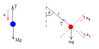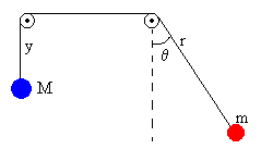 Si y es la posición del contrapeso. La ecuación del movimiento es Al alejarse la masa m aumenta r, el contrapeso M asciende, disminuye y, de modo que Eliminamos T entre la primera y tercera ecuación, llegamos a un sistema de dos ecuaciones diferenciales de segundo orden Llamando μ=M/m