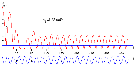 En la parte inferior, la curva de color azul es la fuerza oscilante f=F·cos(ωf·t) La recta de color azul en la parte superior es la amplitud A0 del oscilador forzado en el estado estacionario para la frecuencia ωf=1.28 rad/s de la fuerza oscilante. La curva de color rojo, describe el comportamiento del oscilador que rebota. Después de un estado transitorio que dura algunas oscilaciones, la partícula rebota hasta alcanzar una única altura máxima, esta altura es mayor que la amplitud A0 de la oscilación forzada en el estado estacionario. El movimiento de la partícula se repite después de cada rebote, el sistema precisa de un único rebote para completar un ciclo. Ejemplo 2: En la figura, se muestra el comportamiento del oscilador cuando la frecuencia de la fuerza oscilante es ωf=1.33 rad/s