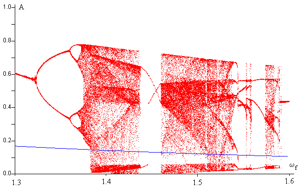 Respuesta en amplitudEn el applet (más abajo), se dibuja en color azul la respuesta en amplitud del oscilador lineal forzado, es decir, la variación de la amplitud con la frecuencia ωf de la fuerza oscilante, y en color rojo, la respuesta en amplitud del oscilador forzado que rebota. En el primer caso, vemos que la amplitud alcanza un máximo en las cercanías de de la frecuencia propia ω0=0.5 rad/s. En el segundo caso, definimos la amplitud como el máximo desplazamiento de la partícula entre dos rebotes consecutivos. La curva presenta un máximo para la frecuencia ωf=1.0 rad/s, y también otros picos secundarios, pero el aspecto más sobresaliente, es la presencia de intervalos de frecuencia donde la amplitud no es única. Para obtener esta curva se ha procedido del siguiente modo: se deja a la partícula rebotar 100 veces para asegurarnos, que se ha alcanzado el estado estacionario. Después, se representa la máxima altura que alcanza la partícula cuando rebota sucesivamente 200 veces con la barrera para cada una de las frecuencias ωf. Cuando se elige el intervalo 0<ωf <5, se observan, de un vistazo, las regiones (intervalos de frecuencias) donde la partícula, rebota alcanzando una única altura máxima, de aquellas en las que alcanza múltiples alturas, donde los puntos están verticalmente dispersos. Por tanto, observamos que un sistema físico simple, el oscilador forzado que rebota, presenta un comportamiento complejo. En la figura, se representa la región 1.3< ωf <1.6, observamos que hasta ωf=1.32, la partícula alcanza una única altura máxima. Luego, alcanza dos alturas máximas, la curva que representa la amplitud se bifurca, después cuatro, a partir de ωf =1.36 rad/s, finalmente, múltiples alturas máximas. Observamos también, que hay un intervalo de frecuencias para las cuales no se observan puntos dispersos, sino cierta regularidad en el comportamiento de la partícula. ActividadesSe introduce