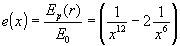 Fuente: Roller, Blum. Physics, Mechanics, Waves and Thermodynamics. Edt. Holden-day (1981), pág. 655. En la simulación vamos usar un potencial e(x) que es independiente de tipo de molécula, tomando x=r/r0. La función e(x) se hace muy grande para valores de x menores que 1, y tiende hacia cero para valores grandes de x. El eje X es su asíntota horizontal. Para x=1 la función e(x) presenta un mínimo cuyo valor es -1. EnergíaLa energía total de la partícula en una posición x es la suma de la energía cinética y potencial E=Ek+Ep(x)