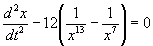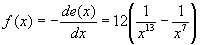 La energía potencial es máxima en los dos puntos más alejados del equilibrio (x=1), y es mínima en la posición de equilibrio. Lo contrario le ocurre a la energía cinética que es cero en los dos puntos más alejados del origen y es máxima en x=1. FuerzaLa fuerza sobre la partícula será como vemos la posición de equilibrio f(x)=0 es x=1, que corresponde a un mínimo cuyo valor es -1. A la izquierda de la posición de equilibrio x<1, la pendiente de la función Ep es negativa y su valor es muy grande (el ángulo es un poco más de 90º), la fuerza es positiva (hacia la derecha). A la derecha de la posición de equilibrio x>1, la pendiente de la curva es positiva y su valor es pequeño (próximo a cero para valores grandes de x), la fuerza es negativa (hacia la izquierda). Ecuación del movimientoLa ecuación del movimiento de una partícula de masa m=1 es Resolvemos esta ecuación por el método de Runge-Kutta para las siguientes condiciones iniciales. En el instante t=0, la posición inicial de la partícula es x0 (a la derecha de la posición de equilibrio) y su velocidad inicial es v0=0. En la posición inicial, la energía cinética de la partícula es cero y por tanto, la energía potencial es igual a la energía total e. Dada la energía total e de la partícula podemos hallar la posición inicial x0, para ello, hay que resolver la ecuación.