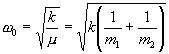 ActividadesEn el programa interactivo se ha fijado el valor de k=2p2 y se permite variar las masas de los átomos m1 y m2 de la molécula diatómica. Por ejemplo, cuando introducimos las masas de las moléculas m1=m2=1, la frecuencia angular de vibración vale w0=2p, y el periodo P=1 unidad de tiempo. El "átomo" A se representa por un círculo de color rojo (a la izquierda), el "átomo" B por un círculo de color azul (a la derecha), y el centro de masas (inmóvil) por un punto de color negro. Una regla nos mide la distancia entre las dos partículas, y entre éstas y el c.m. En la parte superior izquierda, se muestra el valor del tiempo (en unidades arbitrarias), que nos permite medir el periodo de las oscilaciones. Ejemplo: Si m1=2 y m2=1, la frecuencia angular y el periodo de las oscilaciones valen