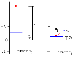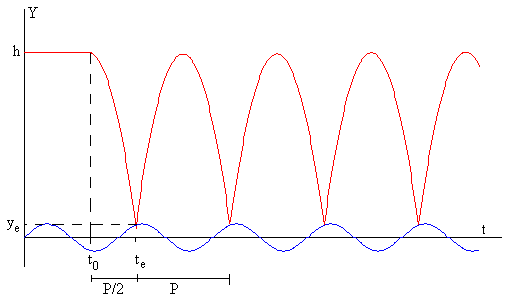 SincronizaciónLa cuestión que se plantea ahora es la de determinar la altura y0=h, y el instante t0, en el que se deja caer la bola para que el periodo P=tn+1-tn de la bola, el tiempo entre dos choques consecutivos, coincida con el periodo P=2π/ω de la oscilación del pistón (en color azul en la figura). Para ello, los choques tendrán lugar en la misma posición ye=yb=yp,
