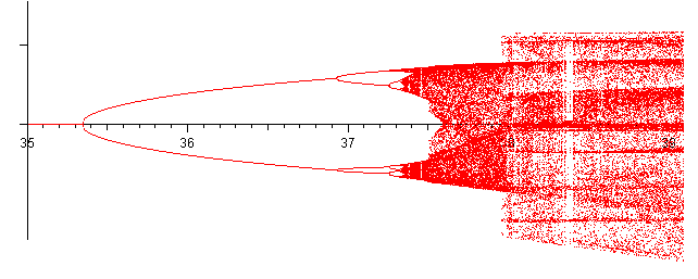 Podemos observar las bifurcaciones y la transición hacia el estado caótico El autor ha elaborado un programa interactivo que no reproduce los resultados mostrados en la figura adjunta. Se suministra el código fuente como punto de partida para que pueda ser mejorado por el lector interesado Se introduce