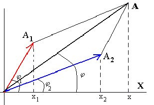 Ejemplo: Componer los MAS de la misma dirección y frecuencia x1=2sen(ωt+π/4)