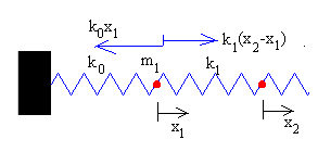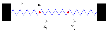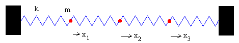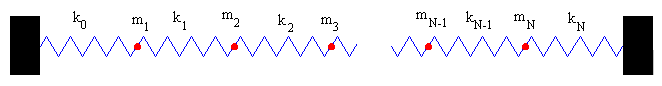 Vamos a estudiar los modos normales de vibración de un sistema formado por muelles y partículas, como continuación y generalización del sistema formado por tres osciladores acoplados. Este ejemplo nos ayudará a comprender los modos normales de vibración de una cuerda fija por sus extremos, también denominados ondas estacionarias. Supongamos un conjunto de partículas de masas m1, m2, m3…mN-1, mN unidas por muelles elásticos de constantes k0, k1, k2, k3, … kN-1, kN.