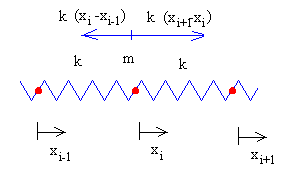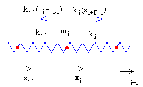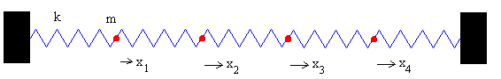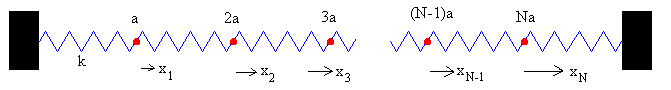 Relación de dispersiónComo vemos en la figura tenemos N partículas de masa m unidas a N+1 muelles iguales de constante k, cuyos extremos están fijos. La separación de equilibrio entre las partículas es a. Supongamos que en un instante dado t, la partícula 1 se desplaza x1, la partícula 2 se desplaza x2, ... la partícula i se desplaza xi, etc.