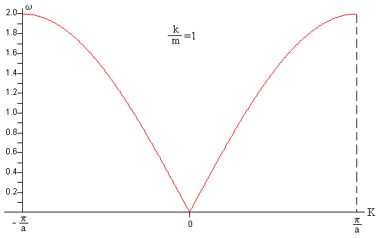 Supongamos, que el sistema vibra en un modo de frecuencia w. Cada partícula describirá un M.A.S. de la misma frecuencia w , pero cuya amplitud Ai vamos a calcular. xi=Ai·cos(w t) Introduciendo esta expresión en la ecuación diferencial que describe el movimiento de cada partícula, obtenemos, la relación entre las amplitudes de los M.A.S. de las partículas i+1, i, e i-1. Buscamos una solución a esta ecuación de la forma Ai=A·sen(K·ia) donde K es el número de onda K=2p/l Asen(Kia+Ka)+ Asen(Kia-Ka)= Asen(Kia)(2-mω2/k) Esta ecuación que relaciona la frecuencia angular w con el número de onda K, se denomina relación de dispersión. En la figura, se representa la frecuencia angular ω en función del número de onda K en el intervalo (-π/a, +π/a). |