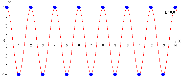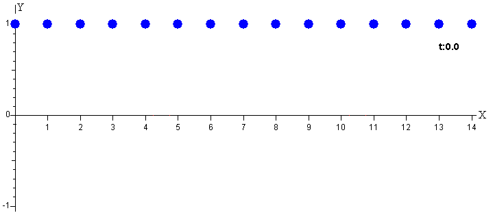 El número de onda k y por tanto, la longitud de onda λ=2π/k= Γd/t no es constante. Es infinita para t=0 (todas las partículas están en una línea recta) y decrece con el tiempo. El programa interactivo traza la función continua de x y t.