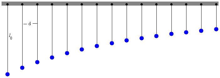En esta página, se simula el movimiento ondulatorio con péndulos no acoplados de distinta longitud. Supongamos un conjunto de péndulos no acoplados de longitud variable, separados la misma distancia d, tal como se muestra en la figura.