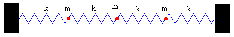 En la página titulada “Dos osciladores acoplados” estudiamos las oscilaciones de dos partículas idénticas unidas a dos muelles de constante k y acopladas por un muelle de constante kc. En esta página, vamos a estudiar un sistema formado por tres partículas de la misma masa m unidas por muelles elásticos iguales de constante k, tal como se muestra en la figura.