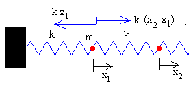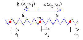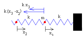 Ecuaciones del movimiento de las partículasSupongamos que la primera partícula se desplaza x1 de la posición de equilibrio, que la segunda se desplaza x2 y la tercera, se desplaza x3. En las figuras, se muestra las fuerzas sobre cada una de las partículas