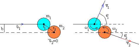 En el capítulo de dinámica hemos estudiado las colisiones unidimensionales elásticas e inelásticas tanto desde el punto de vista de un observador situado en el Sistema de Referencia del Laboratorio como del Sistema de Referencia del Centro de Masa. A continuación, procedimos con el estudio de las colisiones bidimensionales. En ambos casos, hemos aplicado el principio de conservación del momento lineal a un sistema aislado de dos partículas interactuantes y a continuación, hemos efectuado el balance energético de la colisión. En la figura, se muestra un esquema de la colisión de dos discos de masas m1 y m2, y radios r1 y r2 respectivamente. El segundo disco está en reposo u2=0, mientras que el primero lleva una velocidad u1 antes del choque. El choque está caracterizado por el denominado parámetro de impacto b, que es la distancia entre la dirección de la velocidad u1 del primer disco y el centro del segundo disco en reposo. Después del choque, el primer disco se mueve con velocidad v1 haciendo un ángulo φ1 con eje horizontal (dirección de la velocidad u1 del disco incidente) y a su vez, gira alrededor de un eje perpendicular al disco y que pasa por su centro con velocidad angular w1. El segundo disco, se mueve con velocidad v2 haciendo un ángulo φ2 con el eje horizontal y a su vez, gira alrededor de de un eje perpendicular al disco y que pasa por su centro con velocidad angular w2. Tenemos que despejar seis incógnitas del sistema de ecuaciones que describe el choque entre dos discos: