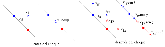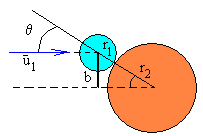 Choques oblicuosParámetro de impacto Se denomina parámetro de impacto b, a la distancia entre la dirección de la velocidad u1 del primer disco y el centro del segundo disco en reposo. La relación entre le parámetro de impacto b y el ángulo θ que forma la dirección de la velocidad u1 del primer disco y la recta que pasa por los centros de ambos discos, cuando entran en contacto en el momento del choque, se puede apreciar en la figura.