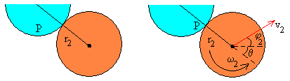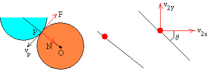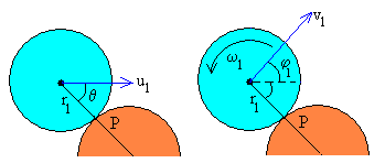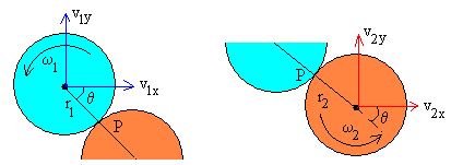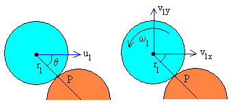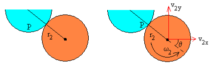 Conocidos los radios de los discos r1 y r2 y el ángulo θ<90º, calculamos el parámetro de impacto b. Dado el parámetro de impacto b<(r1 + r2) calculamos el ángulo θ que introducimos en el control de edición titulado Ángulo b=(r1+r2)·senθ Con los datos introducidos y calculados por el programa interactivo, verificaremos los principios de conservación del momento lineal y angular tal como se ha efectuado en los ejemplos. |