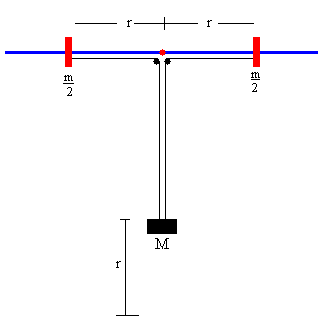 En esta página, se simula una experiencia de laboratorio que nos muestra la conservación del momento angular. Consta de una varilla horizontal que supondremos de masa despreciable que gira alrededor de un eje vertical que pasa por su centro con velocidad angular ω. A lo largo de la varilla, deslizan sin rozamiento dos masas puntuales iguales. Las partículas deslizantes, de masa m/2 cada una, están unidas mediante cuerdas a un bloque de masa M que cuelga, tal como se muestra en la figura.