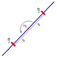 Momento angularEl momento angular inicial es el producto del momento de inercia por la velocidad angular ω0. El momento de inercia es la suma del momento de inercia de la varilla que supondremos despreciable y el de las dos masas deslizantes iguales que distan r0 del eje de rotación