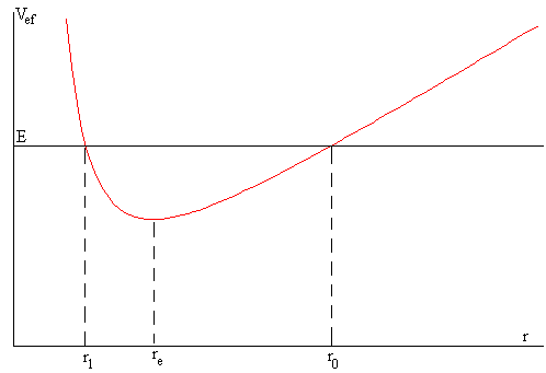 En la figura, vemos la representación gráfica de la energía potencial efectiva Vef(r) cuando las masas deslizantes salen de la posición inicial r0, con velocidad radial nula dr/dt=0. Si su energía total es E (recta horizontal), las masas llegan a la posición de retorno r1 al cabo de un cierto tiempo, cambian el sentido de la velocidad radial y regresan a la posición r0, oscilando con un determinado periodo. La posición de retorno r1 se calcula resolviendo la ecuación Vef(r)=E