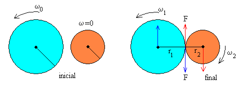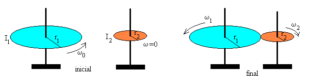 Variación del momento angularEl momento angular inicial es Li=I1·ω0 El momento angular final Lf=I1·ω1f+I2·ω2f Ambos momentos angulares como puede comprobarse no son iguales. La variación de momento angular se puede calcular a partir del impulso angular